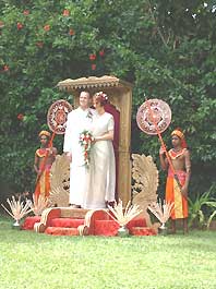Im Garten wurden wir von einem buddhistischen Priester empfangen. Nach einem buddhistischen Lied stiegen wir auf ein Podest. Anschließend tauschten wir dann die Ringe.