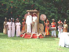 Zum Abschluss der buddhistischen Zeremonie wurde eine Kokosnuss gespalten. Nach singhalesischer Tradition steht die Anzahl der Kokosnuss-Stücke für die Zahl der Kinder, die das Brautpaar bekommt. |